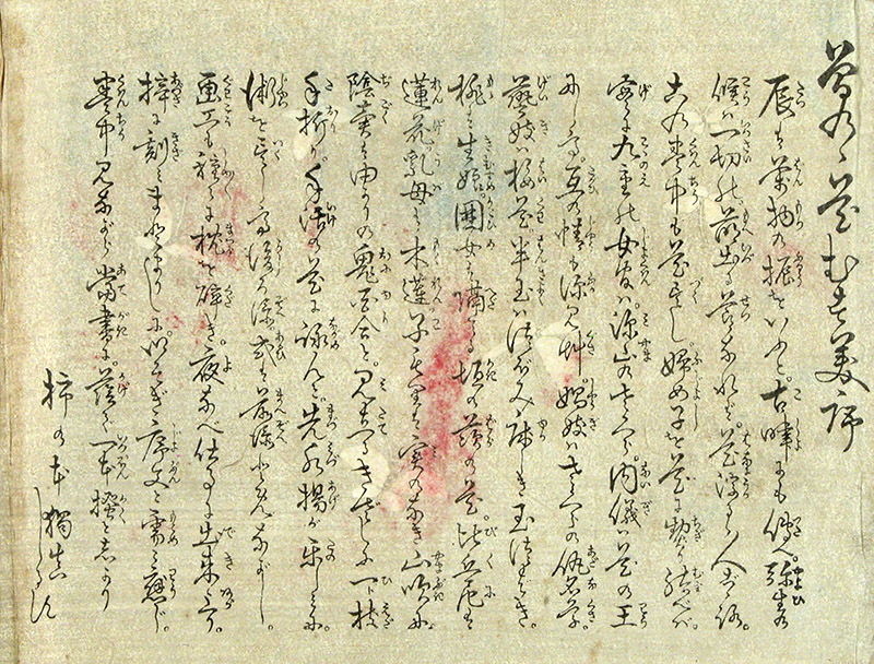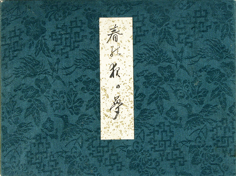 Published: late 19th century Size: chuban yoko-e (17. 5 x 23. 5 cms / c. 7" x 9,25") Condition: Very good impression, fine color; minor wear from use; in good overall condition. - DELUXE printing, black lacquer oveprinting. - Green brocade covers with patterns depicting, a.o., birds and flowers. |