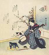 from Japanese folk traditions. WATANABE was born in Tokyo and had no formal artistic education, but became involved in his twenties with figures in the Folk Art Movement. In 1941 he met Serizawa Keisuke and began to learn from him. Serizawa's pictorial influence is very evident in his post-war work. Watanabe began to make his distinctive prints after 1945 and first exhibited in 1947 at the Mingeikan (Folk Art Musuem) in Tokyo ... (more, see: next print ). (Quotes from: Lawrence Smith, "Modern Japanese Prints 1912 - 1989", London, 1984) |