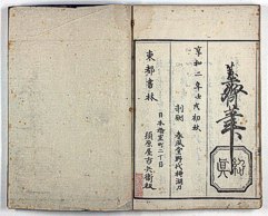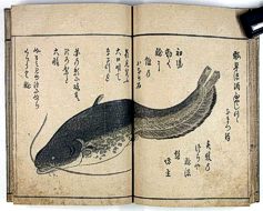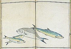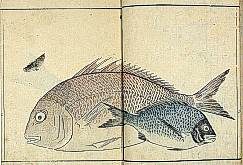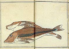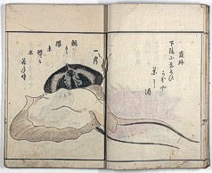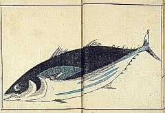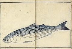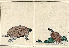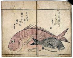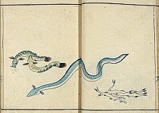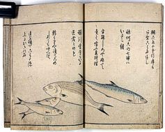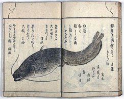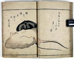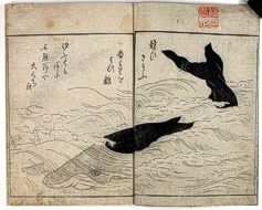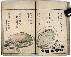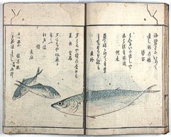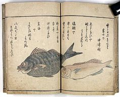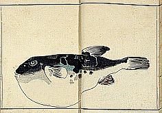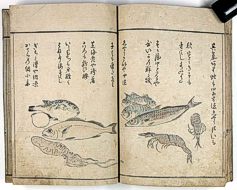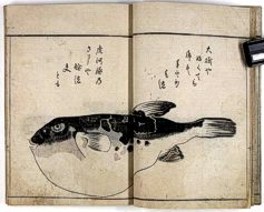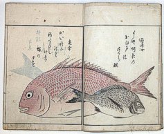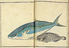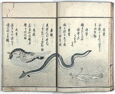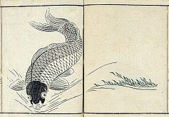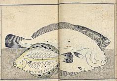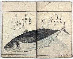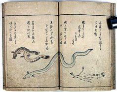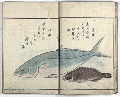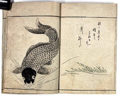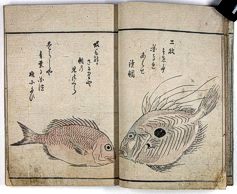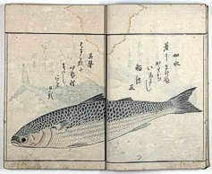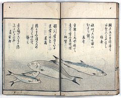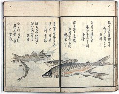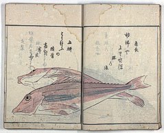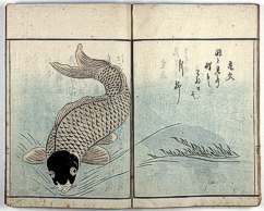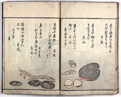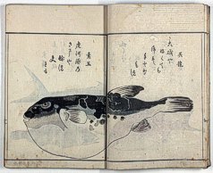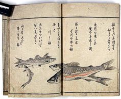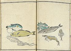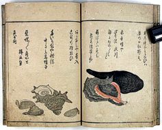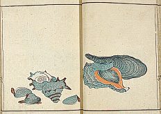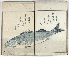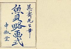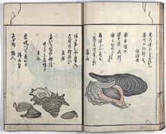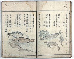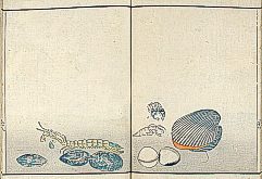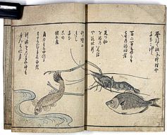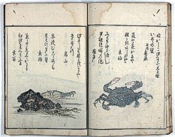 title changed to: Gyokai fu ('The Fish and Shell Album') slightly later, still w/h poems, but poets' names removed; dated: 1802; lost title slip replaced later, carrying a false title: that of the 1813 edition as in the sample at right. |