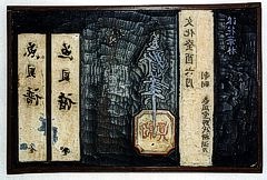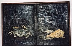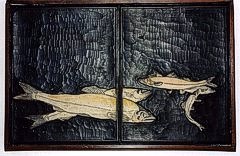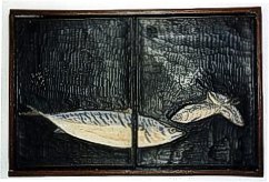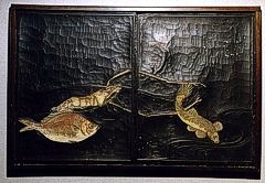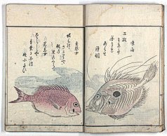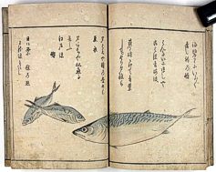 Side-by-side presentation of three editions of Masayoshi's renowned 'Fish and Shell' book, - plus samples of the original printing blocks |