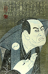 Tsuru-ya Kokei is the official artist of the Kabuki-za ('-Theater') in Tokyo and only started his career as a woodblock print artist in 1978. Unlike earlier ukiyo-e artists, Kokei does his own carving and printing. He uses the extremely delicate ganpi paper for his work. After a limited number of prints has been made, Kokei destroys the blocks by carving his name across them (see picture at right): Most of his prints are bust portraits reminiscent of the type developed by Sharaku in the late 18th century. On the occasion of the one hundredth anniversary of the Kabuki-za in 1988, the Pacific Asia Musuem, Pasadena, Ca., honored Kokei with a major exhibition of his work: Reference catalog: The 100th Anniversary of the Kabuki-za Theater - TSURUYA KOKEI: Kabuki Actor Prints; Pacific Asia Museum, Pasadena, CA., USA, 1988; cat. no.#38, col.ill. p.54, list no.#91, p.97. |